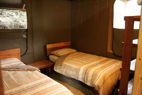 The Type B Chalets are all tented chalets with 2 bedrooms (each with 2 x single beds) and a third small bedroom with 2 x single beds is next to the lounge area. These chalets have a bathroom, kitchen and a deck with table, chairs and seaviews. There are 3 of these tented chalets and the kitchen is equipped with 4 plate gas stove, gas freezer (not fridge) and a deck with table, chairs and a braai (barbeque) area.